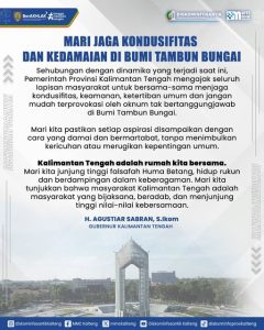 Sehubungan dengan dinamika yang terjadi saat ini, Pemerintah Provinsi Kalimantan Tengah mengajak seluruh lapisan masyarakat untuk bersama-sama menjaga kondusifitas, keamanan, ketertiban umum dan jangan mudah terprovokasi oleh oknum tak bertanggungjawab di Bumi Tambun Bungai.