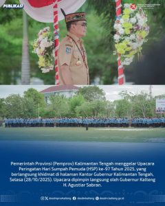 PALANGKA RAYA – Pemerintah Provinsi (Pemprov) Kalimantan Tengah menggelar Upacara Peringatan Hari Sumpah Pemuda (HSP) ke-97 Tahun 2025, yang berlangsung khidmat di halaman Kantor Gubernur Kalimantan Tengah, Selasa (28/10/2025). Upacara dipimpin langsung oleh Gubernur Kalteng H. Agustiar Sabran.