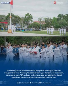 Suasana upacara tampak khidmat dan penuh semangat. Pasukan Pengibar Bendera Pusaka (Paskibraka) bertugas dengan penuh disiplin, sementara para ASN, pelajar, mahasiswa, dan perwakilan berbagai organisasi turut memenuhi halaman Kantor Gubernur.